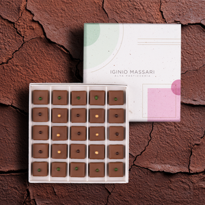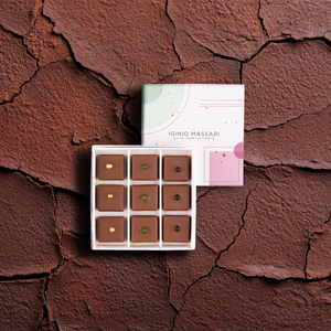 Pralina al pistacchio salato: pralinato di pistacchio e cioccolato bianco con copertura di cioccolato al latte e pistacchio caramellato.