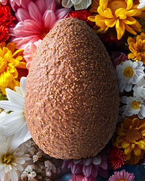 Pralinen-Osterei mit 38% Milchschokolade und Haselnüssen aus geschützter geografischer Angabe.